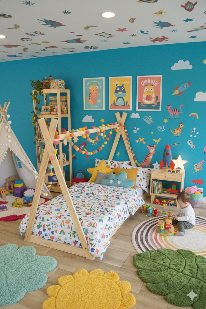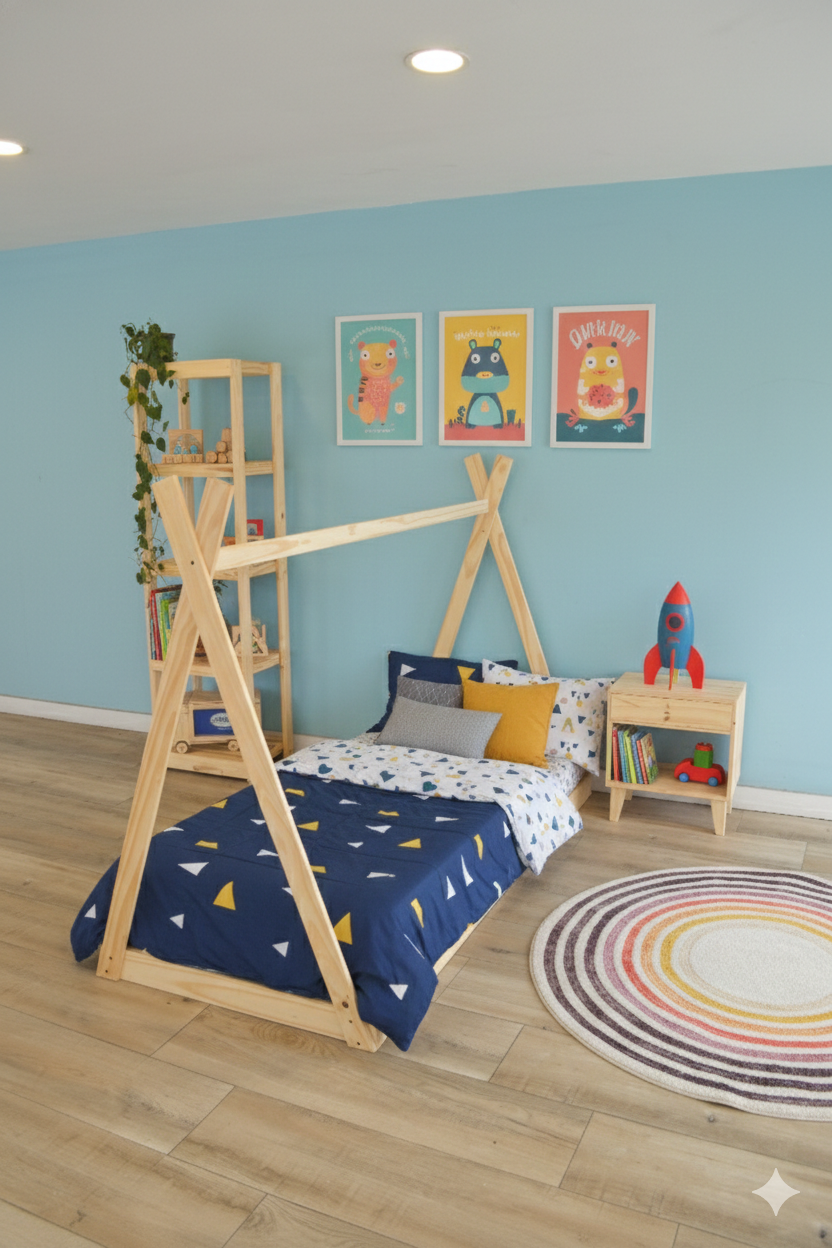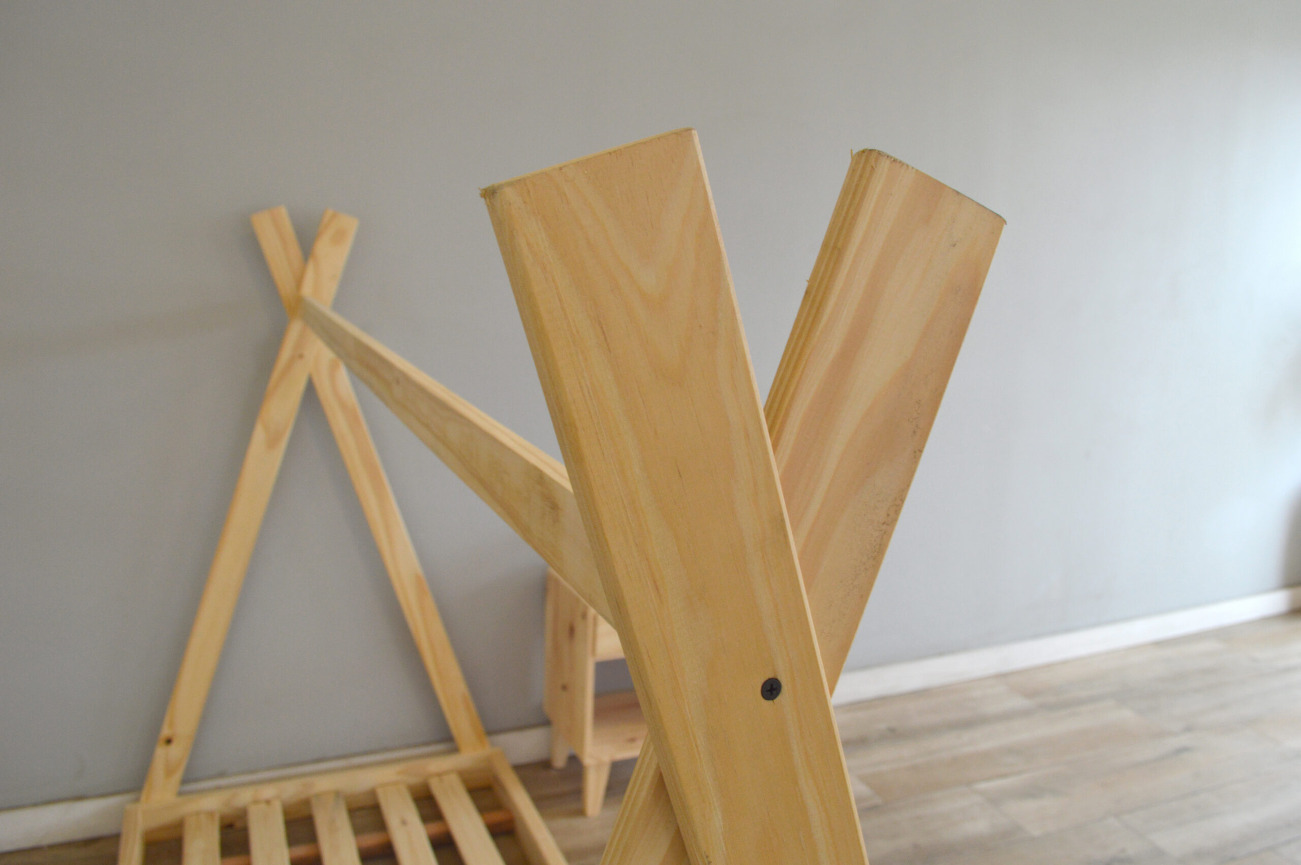 ¿Quién no jugaba a hacer casitas estilo Tipi de niño? Pensando en estos momentos se creó esta cama, para que el momento del sueño pueda mezclarse con el juego y así hacerlo más entretenido. Basada en el estilo Montessori que busca autonomía para el niño o niña.